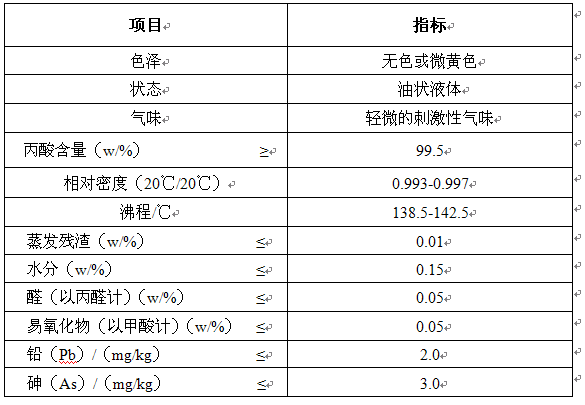 2、丙酸存在于發(fā)酵物中。在白酒中8-24mg/L,濃香型白酒中含量偏高。本制品在白酒與乙酸等酸類協(xié)調(diào)配合,使酒體后味有濃感、甜味、具有后勁。